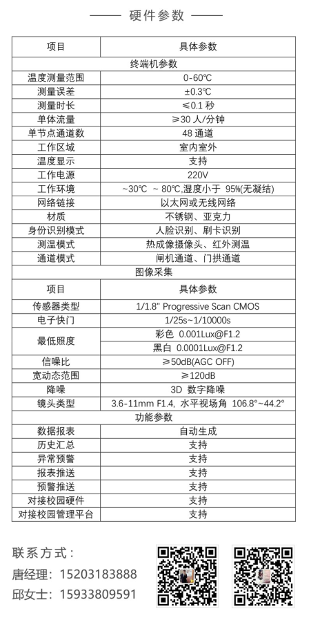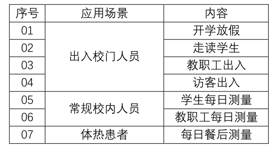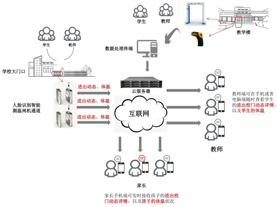 本系統(tǒng)主要以師生體溫為主要參照物,實現(xiàn)疑似患者的快速篩查,并與小優(yōu)智校實施聯(lián)動,實現(xiàn)數(shù)據(jù)的及時上傳、推送,防止病毒大面積傳播。在校園內(nèi)實施多位置,多渠道,多次數(shù)的綜合體溫測量方案,與小優(yōu)智校服務(wù)平臺配套部署,可實現(xiàn)針對傳染類疾病患者的早發(fā)現(xiàn)、早報告,早治療,為校方啟動應(yīng)急預(yù)案,積極應(yīng)對,提供大規(guī)模的基礎(chǔ)數(shù)據(jù),爭取更多有效時間。