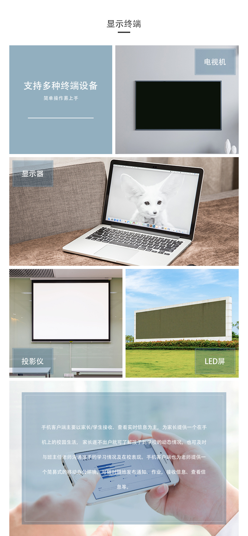 支持電視機(jī)、顯示器、投影儀、LED屏、手機(jī)端等多種顯示終端,簡(jiǎn)單操作易上手。手機(jī)客戶端主要以家長(zhǎng)/學(xué)生接收、查看實(shí)時(shí)信息為主,家長(zhǎng)逐不出戶就可了解孩子到學(xué)校的動(dòng)態(tài)情況,也可及時(shí)與班主任老師溝通孩子的學(xué)習(xí)情況及在校表現(xiàn)。手機(jī)客戶端也為老師提供一個(gè)簡(jiǎn)易式的移動(dòng)辦公環(huán)境,可隨時(shí)隨地發(fā)布通知、作業(yè),接收信息、查看信息等。